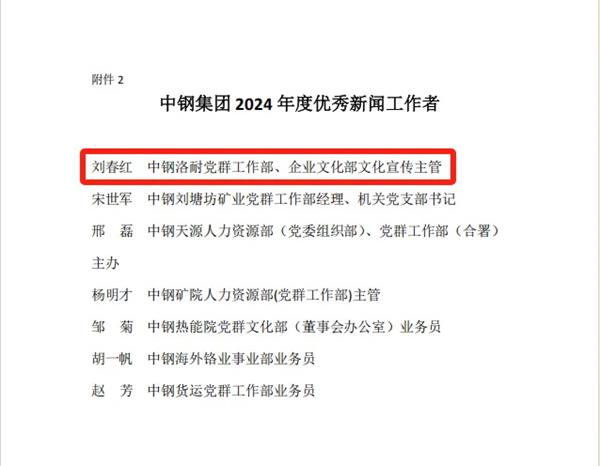 近日,中鋼集團2024年度優秀新聞作品、優秀新聞工作者評選結果揭曉,中鋼洛耐4部作品脫穎而出,榮獲“中鋼集團2024年度優秀新聞作品”,中鋼洛耐劉春紅獲評“中鋼集團2024年度優秀新聞工作者”。